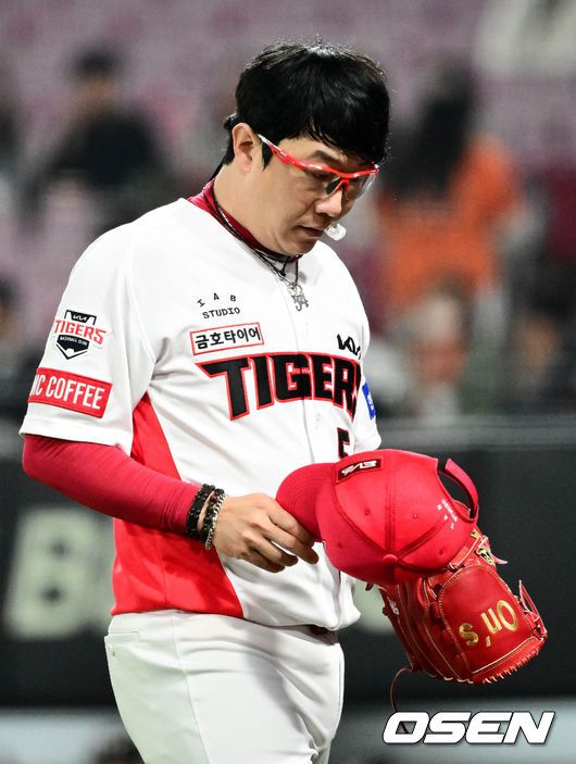 [OSEN=광주, 조은정 기자]11일 광주 북구 KIA챔피언스필드에서 ‘2023 신한은행 SOL KBO리그’ KIA 타이거즈와 한화 이글스의 경기가 열렸다.5회초 이닝을 마친 KIA 선발 양현종이 더그아웃으로 향하고 있다. 2023.04.11 /cej@osen.co.kr