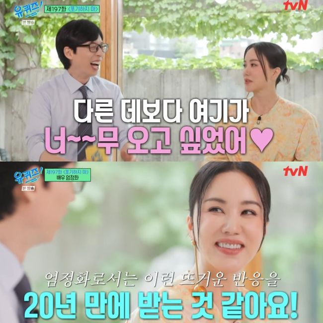 7일에 방송된 tvN ‘유 퀴즈 온 더 블럭’(이하 ‘유퀴즈’)에서는 ‘포기하지 마’ 특집으로 꾸며진 가운데 대한미국 최고의 디바 엄정화가 등장했다. 엄정화는 “나 드디어 여기 앉아보는 구나”라며 “나 너무 오고 싶었다. 너무 안 불러줘가지고. 정말 다른 데보다 여기가 너무 오고 싶었다”라며 서운함을 드러냈다.