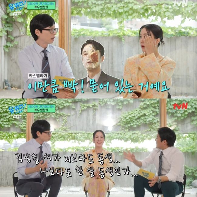 유재석은 엄정화가 김병철 얼굴을 케이크에 묻었던 장면을 언급했다. 엄정화는 “완전 제가 너무 잘했다. 팍! 이렇게 했는데 얼굴에 카스텔라가 이만큼 묻어있더라. 저 진짜 입술을 깨물었다. NG 안 내려고. 근데 저쪽 부스에서 웃음이 터져서 NG가 났다”라며 비하인드 스토리를 전했다. 이때 유재석이 “김병철 씨가 동생이죠?”라고 묻자 엄정화는 “그 이야기를 왜 해?”라고 발끈해 웃음을 자아냈다. 그러자 유재석은 “아니, 김병철 씨는 저보다도 동생인데”라고 웃었고, 조세호는 “생물학적 나이로는 그렇지 않나”라고 수습했다.
