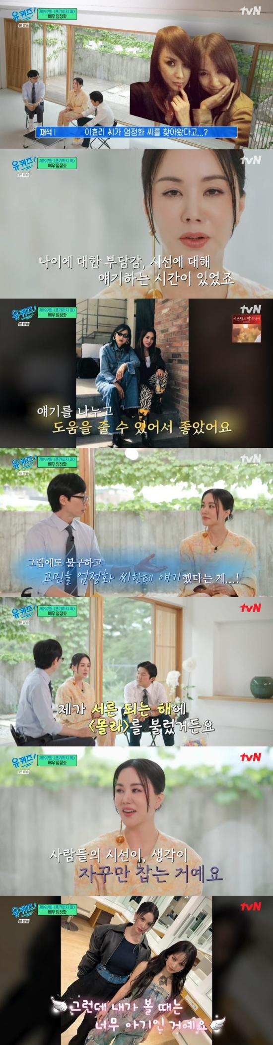 엄정화는 "효리도 용기 있게 고민을 이야기했던 것 같고 저보다 더 많은 중압감을 느꼈을 것 같다. 효리의 인기는 더 대단했기 때문에. 제가 마흔이 됐을 때 30대가 되는 효리를 볼 땐 아직 너무 아기인 거다. 제가 서른이 되는 해에 '몰라'를 불렀다"라며 회상했다.