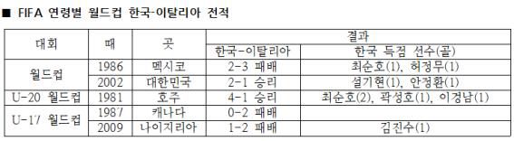 한국과 이탈리아는 FIFA가 주최·주관하는 월드컵을 비롯해 각종 연령별 무대에서 모두 다섯 번 자웅을 겨뤘다. 그때마다 세계 축구계는 이탈리아의 우세를 점쳤다. 그러나 축구공은 역시 둥글었다. 월드컵에선, 호각세(1승 1패)였다. 그 다음 단계인 U-20 월드컵에선, 한국이 앞섰다(1승), 가장 어린 선수들의 마당인 U-17 월드컵에선, 이탈리아가 우세했다(2승), 그야말로 팽팽했다고 할 만하다(표 참조).