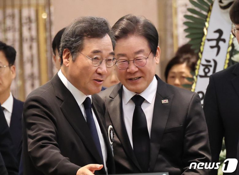 이낙연 더불어민주당 전 대표가 지난 4월 9일 오후 서울 강남구 삼성서울병원 장례식장에 마련된 장인 김윤걸 전 교수의 빈소에서 이재명 대표를 배웅하고 있다.  이 전 대표는 오는 24일 귀국할 예정이다. ⓒ News1 임세영 기자