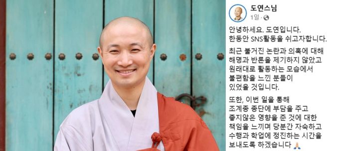 도연 스님은 지난 7일 페이스북에 "최근 불거진 논란과 의혹에 대해 해명과 반론을 제기하지 않았다"며 "원래대로 활동하는 모습에 불편함을 느낀 분들이 있었을 것"이라고 적었다.