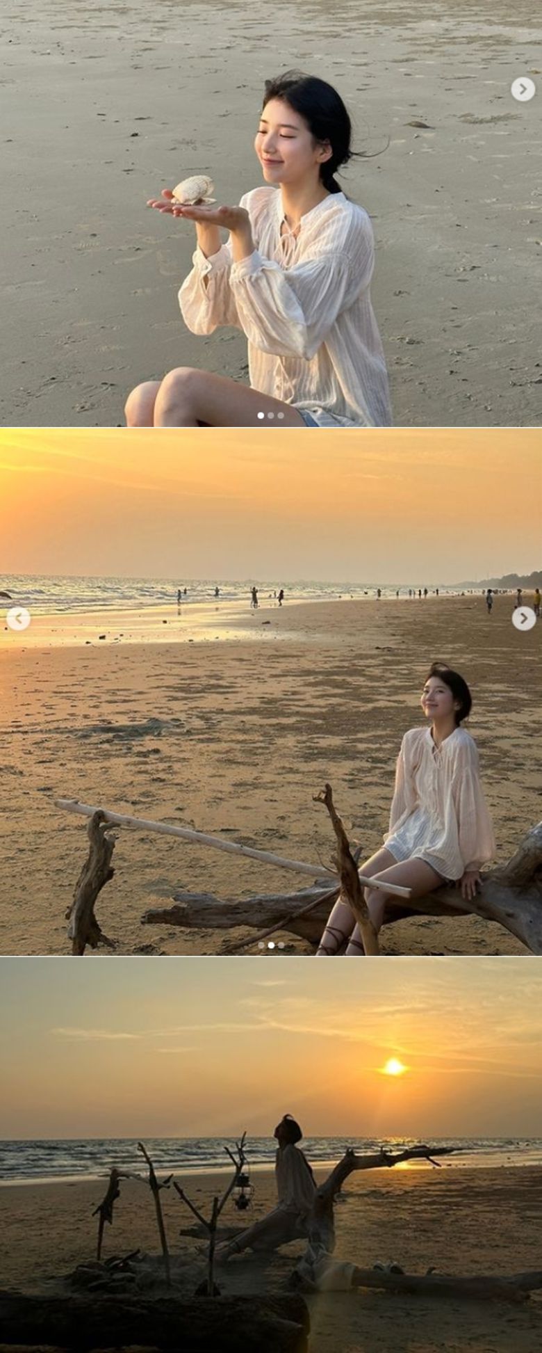 사진 속에는 루즈한 핏의 흰색 블라우스를 입고 해변가에 앉아 포즈를 취하고 있는 수지의 모습이 담겨 있다.