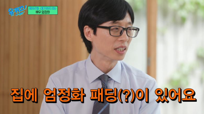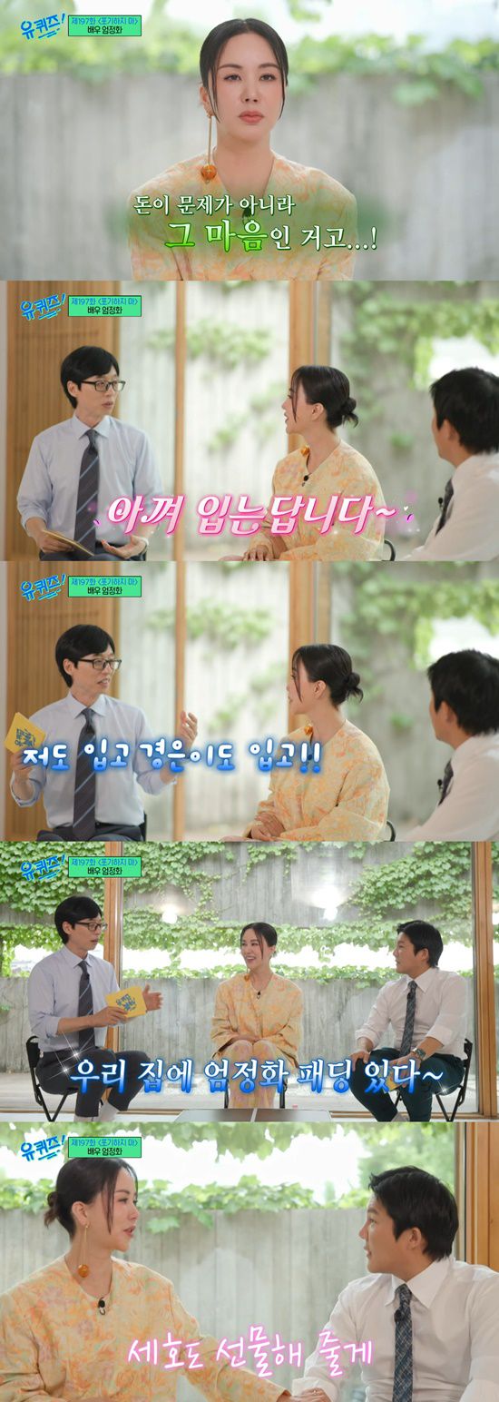 이에 유재석은 "저희 집에 엄정화 패딩이 있다. 누나가 줬다. 아껴입는다. 저도 입고 경은이도 입는다"며 "색이 정말 예쁘다"고 했다.