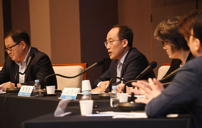'경기 하강 상황에서 추경을 안 하면 서민들이 어려움을 오히려 더 키우는 것 아니냐'는 지적도 있다는 패널 질의에 추 부총리는 "현재는 추경을 전혀 검토하고 있지 않다"고 잘라 말했다.