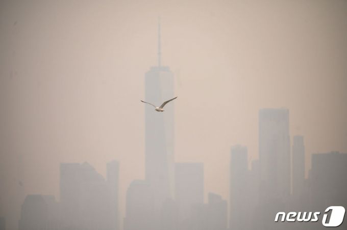 (뉴욕 AFP=뉴스1) 우동명 기자 = 6일 (현지시간) 캐나다에서 발생한 산불의 영향으로  연기로 덮여 뿌옇게 변한미국 뉴욕 맨해튼의 빌딩 사이로 갈매기가 날고 있다. 2023.6.8  ⓒ AFP=뉴스1  Copyright (C) 뉴스1. All rights reserved. 무단 전재 및 재배포 금지.