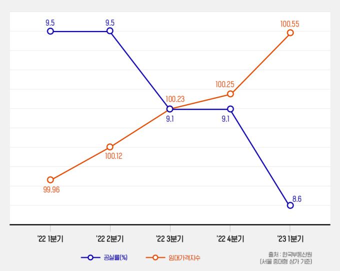 공실률이 줄자 임대료도 우상향 중인 것으로 집계됐다. 한국부동산원이 발표한 올해 1분기 전국상업용부동산 임대동향조사 결과에 따르면 서울의 오피스와 모든 상가 유형의 임대료는 지난 분기 대비 상승했다. 중대형 상가는 0.30% 오른 ㎡당 5만2200원을, 소규모 상가는 0.23% 오른 ㎡당 4만9000원을 기록했다. 임대가격지수도 올해 1분기 100.55를 기록하며 4분기 연속 상승세를 보이고 있다.