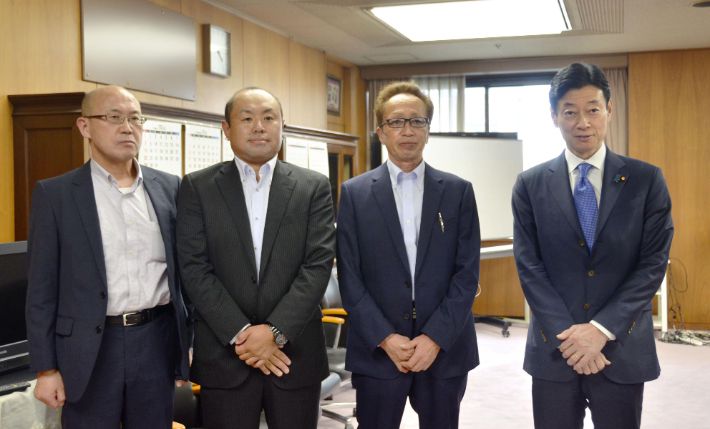 후쿠시마현 소마시의 후타바어업협동조합 곤노 토시미츠(64)조합장 일행이 니시무라 야스토시 경제산업상(맨우측)을 만나 어민들의 불안감을 전했다. 연합뉴스 |