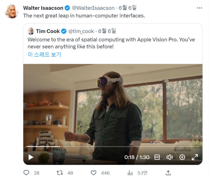 스티브 잡스의 전기를 쓴 월터 아이작슨은 5일(현지시간) 자신의 트위터에 애플의 MR 헤드셋 ‘비전 프로’에 대해 “인간-컴퓨터 인터페이스에 있어서 다음의 거대한 도약”이라고 썼다. 월터 아이작슨 트위터 캡처 화면.