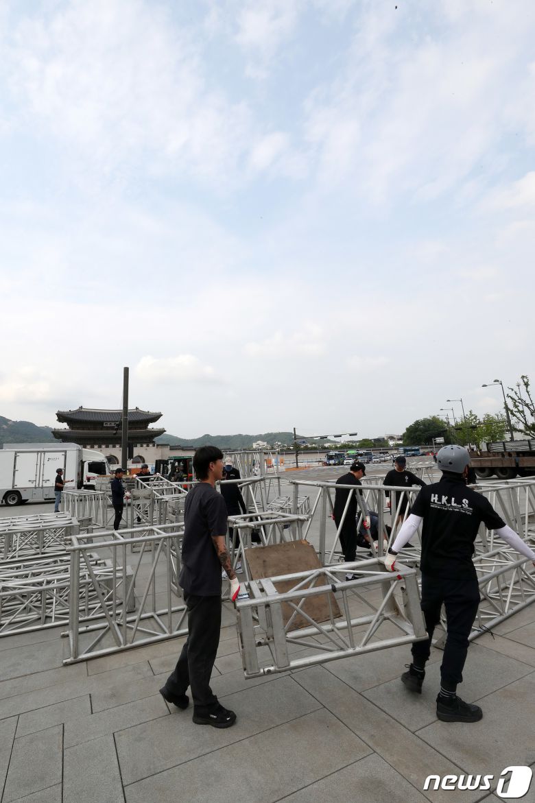 (서울=뉴스1) 박세연 기자 = 8일 오후 서울 광화문광장에서 관계자들이 U-20월드컵 4강전 거리응원 무대를 설치하고 있다. 아르헨티나에서 열린 이번대회에서 두 대회 연속 4강에 오른 대한민국 U-20 대표팀은 9일 오전 6시 이탈리아와 4강전을 치른다. 2023.6.8/뉴스1