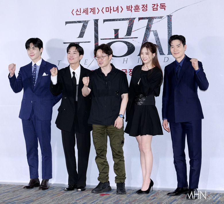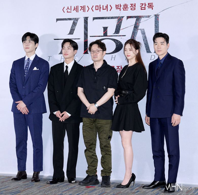 배우 김선호, 강태주, 박훈정 감독 고,아라, 김강우가 8일 오후 서울 강남구 코엑스 메가박스에서 진행된 영화 '귀공자'(감독 박훈정) 언론 시사회에 참석해 포즈를 취하고 있다.