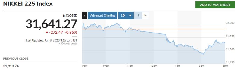 일본 증시 닛케이225지수는 전날보다 272.47포인트(0.85%) 하락한 3만1641.27에, 토픽스지수는 14.80포인트(0.67%) 떨어진 2191.50에 장을 마감했다.