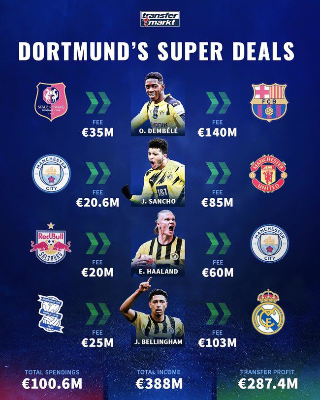 먼저 뎀벨레는 3,500만 유로(약 490억 원)에 데려와 1억 4,000만 유로(약 1,960억 원)에 바르셀로나로 판매했다. 산초는 2,060만 유로(약 290억 원)에 영입했고 8,500만 유로(약 1,190억 원)에 이적했다. 홀란드는 2,000만 유로(약 280억 원)에 넘어와 6,000만 유로(약 840억 원)에 떠났다. 마지막으로 벨링엄은 2,500만 유로(약 350억 원)에 합류했다가 1억 300만 유로(약 1,440억 원)로 나갔다.