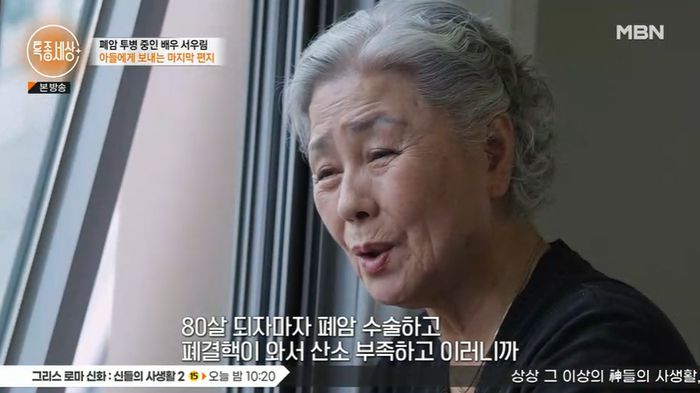 2년 전 수술까지 총 세 번의 수술을 한 서우림은 “한 달은 밖에 못 나갔다. 코에 산소 호흡기를 쓰고 있었다. 80살 되자마자 폐암 수술하고 폐결핵이 와서 산소 부족하고 이러니까”라고 밝혔다.