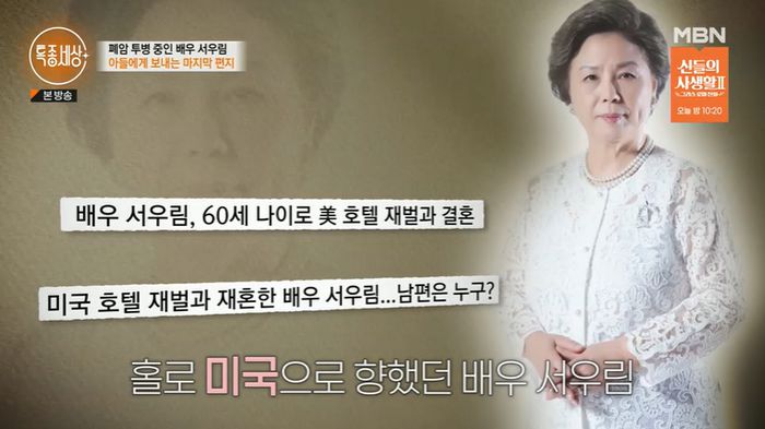 두 번의 결혼을 한 서우림은 “(첫 번째 남편은) 서울대학교를 졸업했다고 해서 반했고 인물도 늘씬하고 혹해서 결혼했다. 결혼할 때도 전세금도 없었다. 몇만 원씩 내고 살았다. 방송을 해서 집 마련했고 그 당시에 카바레를 갔었다. 거기서 춤을 추고 있더라 어떤 여자하고. 누군지 알아봤더니 사귀는 여자였다. 나중에 사실을 알게 되고 이혼했다. 두 아들들이 남편 성격 닮을까 봐 미국의 유학 보냈다. 유학비 내고 방송 생활을 할 수 있어서 감사했다”고 밝혔다.
