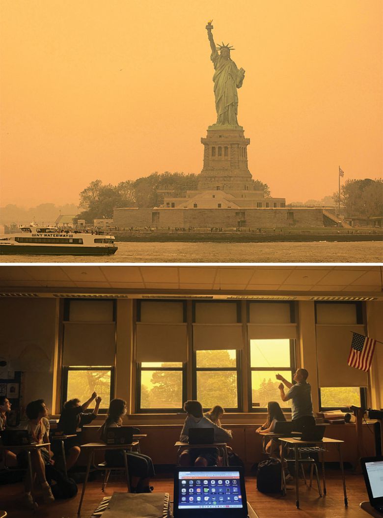 캐나다 남동부에서 사흘째 이어진 산불로 인한 연기가 북서풍을 타고 국경을 넘어 뉴욕을 비롯한 미 동북부 하늘을 덮었다. 이날 뉴욕 공기질은 세계 주요 도시 중 최악으로 나타났다. 공기 오염으로 악명 높은 인도 뉴델리나 아랍에미리트 두바이보다도 나빴다. 오전까지만 해도 하늘이 뿌연 정도라 센트럴파크에서 축구를 하거나 피크닉을 즐기는 이들이 적지 않았지만 오후 1시 이후 연기가 짙어지더니 세상이 온통 주황빛으로 변했다.