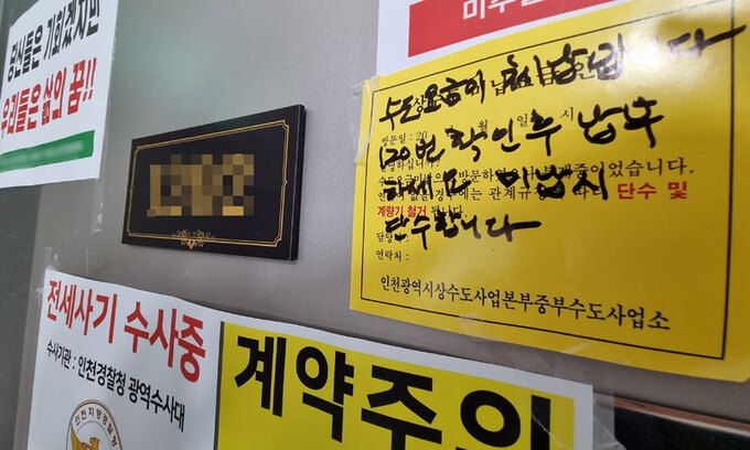 지난 4월 17일 인천 미추홀구 한 아파트 현관문 앞에 전세사기 수사 대상 아파트임을 알리는 안내문이 부착돼 있다. 뉴시스