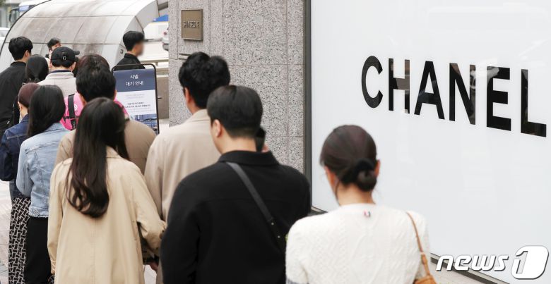 서울 한 백화점 명품관 앞에서 고객들이 입장 순서를 기다리며 길게 줄을 서 있다. 2023.4.16/뉴스1 ⓒ News1 민경석 기자 |