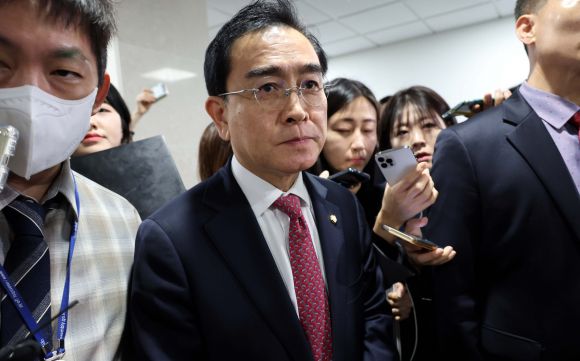 취재진 질문받는 태영호 - 국민의힘 태영호 최고위원이 지난달 10일 국회 소통관에서 최고위원직 자진 사퇴 기자 회견 뒤 취재진의 질문을 받으며 이동하고 있다. 연합뉴스 |
