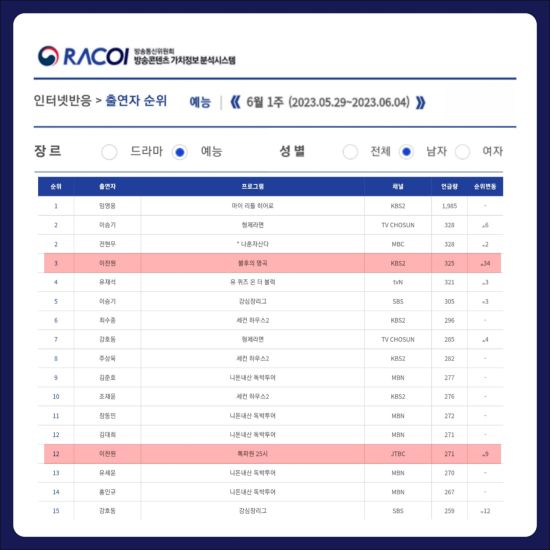 RACOI(방송통신위원회 방송콘텐츠 가치정보 분석 시스템)에 따르면, 이찬원은 6월 1주(2023.05.29.~2023.06.04.) 인터넷 반응 분석에서 KBS2 '불후의 명곡'으로 남성 예능 출연자 중 3위에 올랐다. 같은 랭킹(남성 출연자 기준)에서 이찬원은 JTBC '톡파원 25시'로도 12위에 안착하며 화제성을 입증했다.