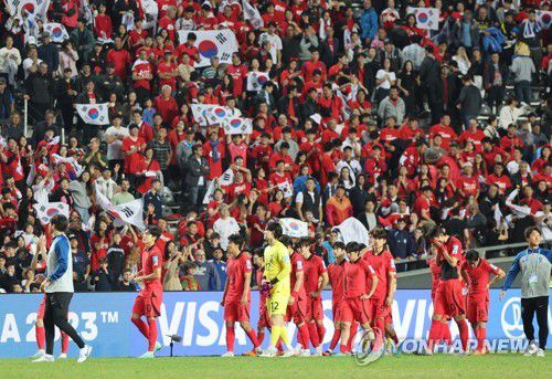 (라플라타=연합뉴스) 임화영 기자 = 8일(현지시간) 오후 아르헨티나 라플라타 스타디움에서 열린 2023 국제축구연맹(FIFA) 20세 이하(U-20) 월드컵 4강전 한국과 이탈리아의 경기. 후반 종료 전 결승 골을 내주고 1-2로 패한 한국 선수들이 경기 종료 후 응원 온 관중에게 인사하고 있다. 2023.6.9