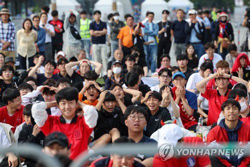 (서울=연합뉴스) 신현우 기자 = 2023 국제축구연맹(FIFA) 20세 이하(U-20) 월드컵 4강전 한국과 이탈리아의 경기가 열린 9일 오전 서울 종로구 광화문광장에서 거리 응원에 나온 축구팬들이 아쉬워하고 있다. 2023.6.9