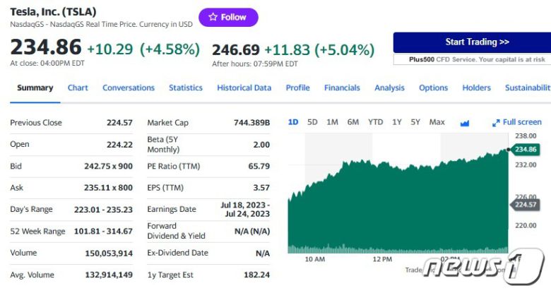 8일(현지시간) 뉴욕증시 시간외거래에서 테슬라는 5.04% 급등한 246.69 달러를 기록하고 있다. 테슬라는 앞서 정규장도 4.58% 급등 마감했었다.