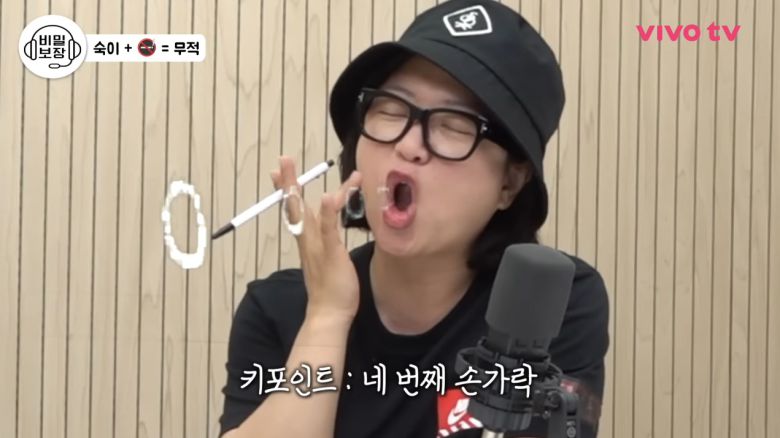 그러자 김숙은 "담배근이 있다. 여기에 담배가 꽂혀있죠? 담배를 떨어트리는 건 하수다. 무슨 일이 있어도, 물에 빠져도 이건 쥐고 있어야 한다. 담배 피우다가 넘어져도, 갑자기 저기서 물바가지가 날아와도 담배는 지킨다"고 강조했다. 그러면서 "극한 상황에서도 여기서(손가락 사이에서) 빠지지 않는다"고 덧붙였다.