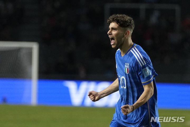 [라플라타=AP/뉴시스] 이탈리아의 시모네 파푼디가 8일(현지시각) 아르헨티나 라 플라타의 디에고 마라도나 스타디움에서 열린 2023 국제축구연맹(FIFA) 20세 이하(U20) 월드컵 4강 한국과의 경기 후반 41분 프리킥으로 결승 골을 넣고 환호하고 있다. 이탈리아가 한국을 2-1로 꺾고 결승에 올라 우루과이와 우승을 다툰다. 2023.06.09.