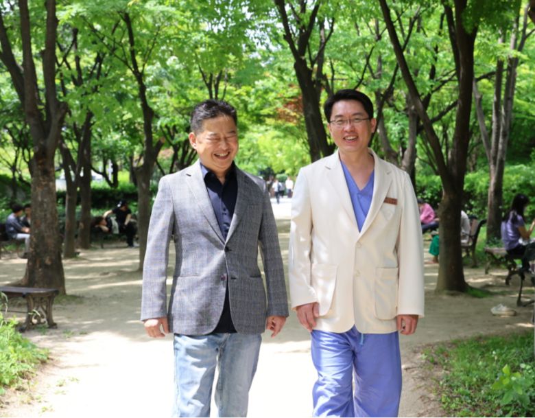 김용덕 씨(왼쪽)는 15년 동안 확장성심근병증으로 고생하다 지난해 11월 심장이식 수술 후에 완치됐다. 김 씨가 수술을 담당했던 조양현 삼성서울병원 심장외과 교수와 함께 병원 산책로를 걷고 있다. 삼성서울병원 제공