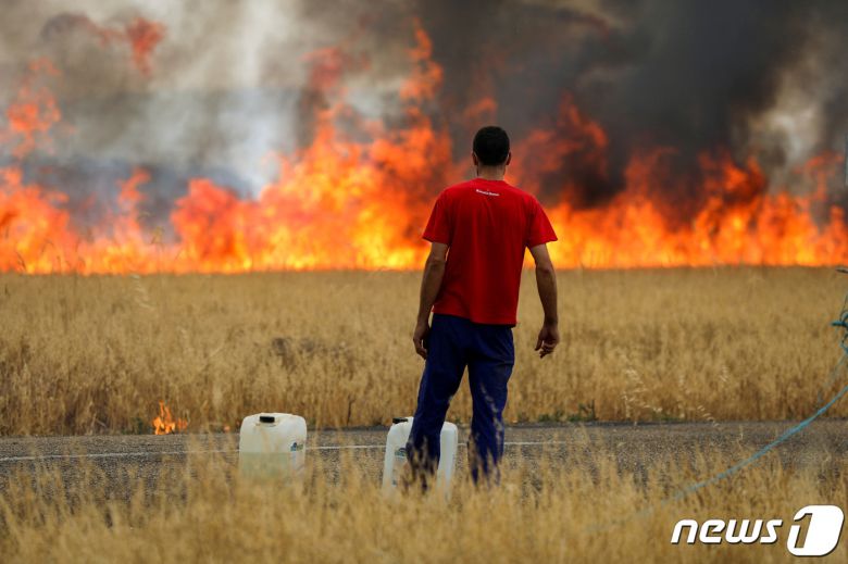 18일(현지시간) 스페인 사모라 지방에서 한 양치기가 올 들어 두 번째 폭염을 겪고 있는 타바라의 밀밭을 태우고 있는 불길을 지켜보고 있다. ⓒ 로이터=뉴스1 ⓒ News1 유민주 기자