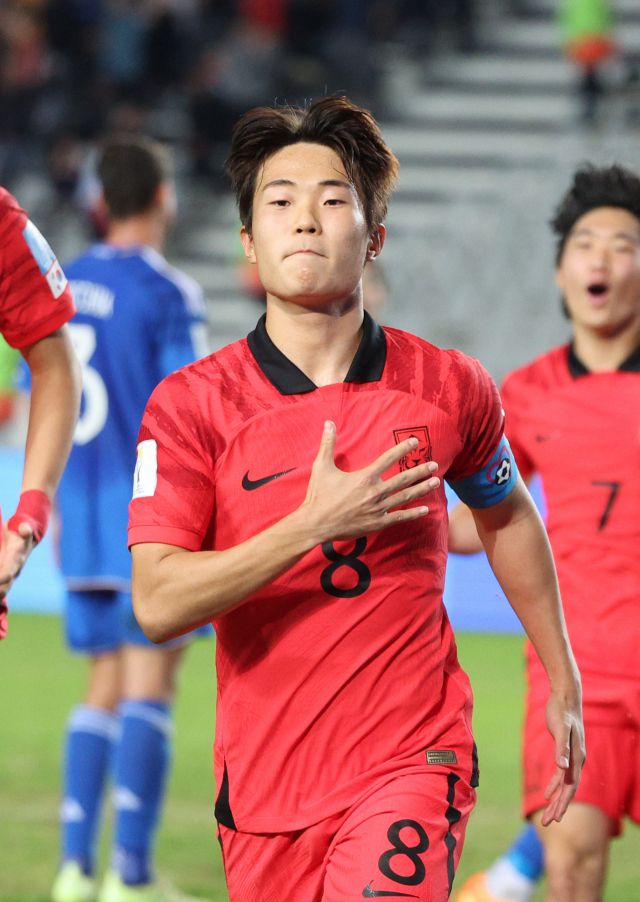 ‘황금 오른발’ 이승원은 이번 대회 공격 포인트를 2골 4도움으로 늘렸다. 2019년 이 대회 준우승을 이끌며 골든볼(MVP)을 수상했던 이강인(마요르카)의 당시 기록(2골 4도움)과 어깨를 나란히 한 것이다. 주장 이승원은 “고개 숙인 선수도, 눈물을 보인 선수도 있지만 아직 우리의 대회가 끝난 게 아니다. 다음 경기에서 꼭 결과를 가져오자고 (선수들에게) 이야기했다”고 말했다.