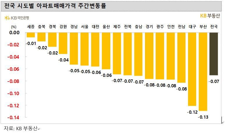 눈길을 끄는 것은 KB 통계 기준으로 이번주(5일) 서울 아파트값은 낙폭이 더 커졌다. 이번주 서울 아파트 매매가는 -0.05%의 변동률을 기록했다. 전주에는 -0.04%를 기록했다. KB 통계 기준으로는 여전히 하락행진이 이어지고 있다.