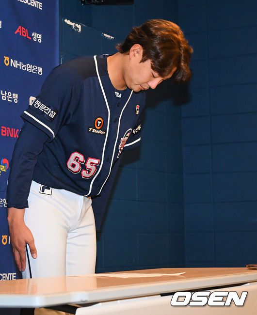 [OSEN=창원, 이석우 기자] 두산 베어스 정철원이 1일 창원 NC파크에서 WBC대회 술자리 파문과 관련해 사과 인사를 하고 있다. 2023.06.01 / foto0307@osen.co.kr |