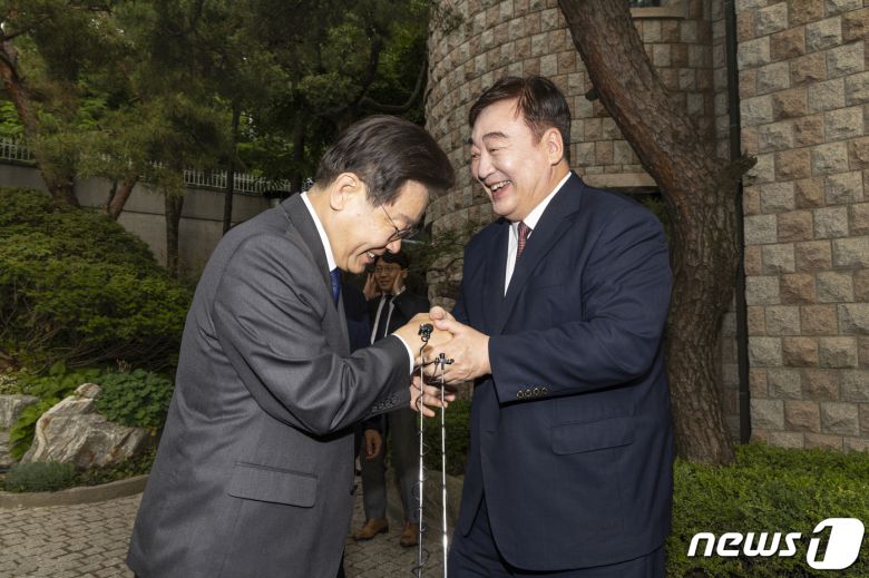 이재명 더불어민주당 대표가 8일 오후 서울 성북구 중국대사관저를 방문해 싱하이밍 주한중국대사와 인사를 나누고 있다. 2023.6.8/뉴스1 ⓒ News1 국회사진취재단 |