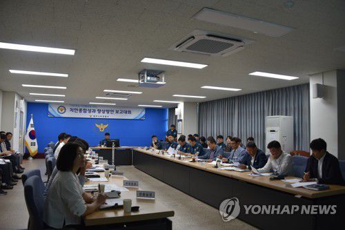 (광주=연합뉴스) 9일 오전 광주 서부경찰서에서 문병훈 서장 주재로 '치안종합성과 향상회의·범죄 근절 예방 관련 회의'가 열리고 있다. 회의 참가자들은 2023년 성과평가 정량지표 달성도를 공유하고 향후 추진사항에 대해 논의했다. 2023.6.9 [광주 서부경찰 제공. 재판매 및 DB 금지]