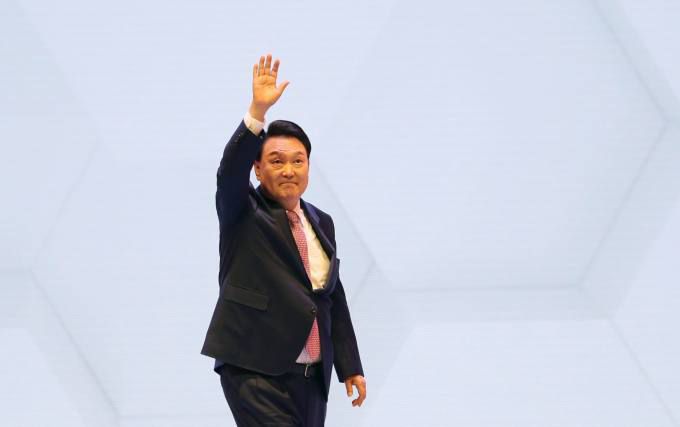 윤석열 대통령이 9일 강원 춘천시 강원대학교 백령아트센터에서 열린 강원특별자치도 출범 기념식에서 축사를 마친 뒤 손을 들어 인사하고 있다. 연합뉴스