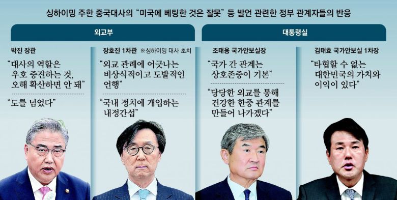 장 차관은 이날 “싱 대사의 이번 언행은 상호존중에 입각해 한중 관계를 중시하고 발전시켜 나가려는 양국 정부와 국민들의 바람에 심각하게 배치되는 것”이라고 비판했다. 또 “한중 우호의 정신에 역행하고, 양국 간 오해와 불신을 조장하는 무책임한 것임을 단호하고 분명하게 지적한다”고 했다. 그러면서 싱 대사에게 “이번 언행 관련해 외교사절의 본분에서 벗어나지 않도록 처신해야 할 것, 모든 결과는 본인 책임이 될 것임을 분명히 경고했다”고도 했다.