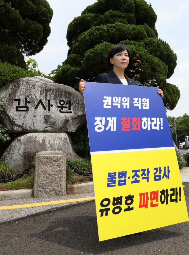 1인 시위하는 전현희 전현희 국민권익위원장이 9일 감사원의 감사결과보고서 발표 전 감사원 앞에서 1인 시위를 하고 있다. 뉴시스