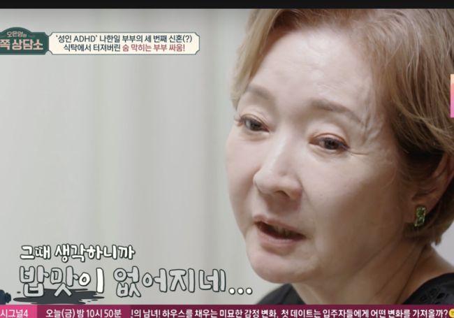 약 두 달만에 다시 방문한 두 사람. 나한일은 “당시 성인 ADHD( 주의력결핍 과다행동장애) 에 대해 진단, 상담이 충격이었다”고 했고 유혜영은 “증상을 알게 된 후 남편을 이해하고 살피게 됐다”고 했다. 그러면서 일상 속 불편함을 고칠 방법이 없을지 물었다. 오은영은 “실생활 맞춤 솔루션이 필요하다”며 족집게 원 포인트 레슨을 할 것이라며 기대감을 안겼다.