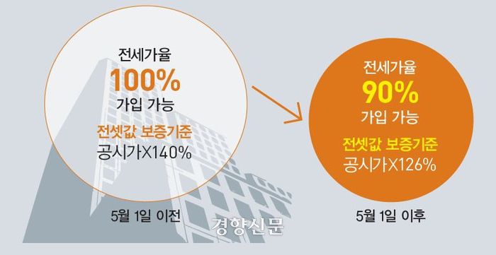 전세계약이 줄어드는 것을 두고 정부의 책임을 지목한 이유는 주택도시보증공사(HUG·허그)의 전세보증금반환보증 가입 요건 강화 때문이다. 전세사기로 인한 문제가 심각해지자 정부는 대책을 내놨다. 그 핵심이 허그를 통한 반환보증 가입 요건 강화다. 이른바 ‘126% 룰’이라고 불리는 이 대책은 주택가격 산정 시 공시가 적용 비율을 150%에서 140%로 강화한 데 이어, 전세가율(집값 대비 전셋값 비율)을 100% 이하에서 90% 이하로 하는 것을 골자로 한다. 이에 따라 반환보증에 가입하려면 공시가의 126% 이하여야만 가능하다. 쉽게 말해, 전셋값을 낮춰야 반환보증에 가입시켜주겠다는 의미다. 그런데 여기서 혼동하지 말아야 할 것이 전셋값이 내린다고 임차인이 집을 빌린 대가로 지급해야 할 돈이 줄어드는 것은 아니라는 점이다.