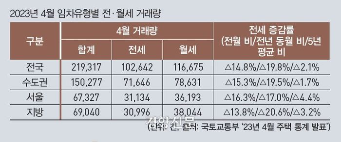 인정하든, 그렇지 않든 정부 정책이 가리키고 실제 시장에서 작동하는 방향은 전세의 축소다. 그럼에도 전세계약은 여전히 전체 거래량의 50% 정도를 차지한다. 국토교통부가 지난 5월 30일 발표한 ‘23년 4월 주택 통계 발표’에 따르면 전체 21만9317건의 전·월세 거래량 중 10만2642건이 전세 거래였다. 다만 전세 거래량은 전월 대비 14.8%, 전년 동월 대비 19.8% 감소했다. 전세로 임대차 계약을 체결하는 비율은 줄고 있지만 여전히 50%에 달한다는 것이다.