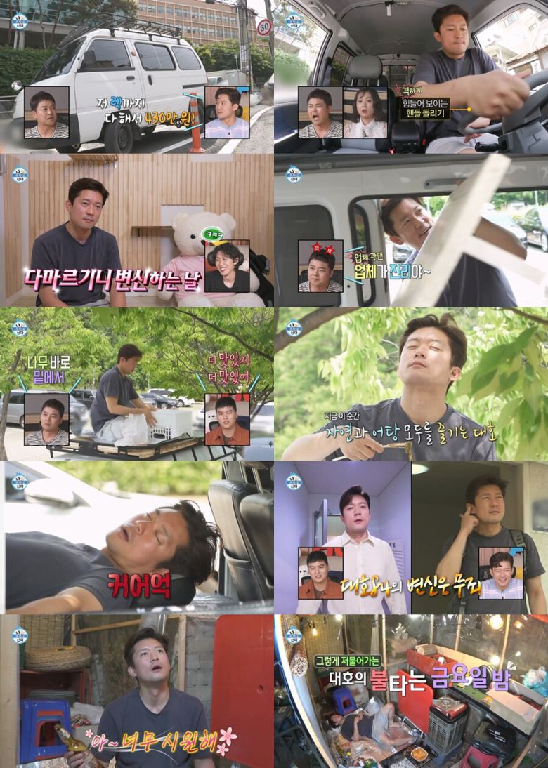 목적지는 김대호 아나운서가 평소 자주 찾는다는 MBC 근처 행주산성이었다. 특보 대기 근무 후 오후 생방송 진행을 위해 출근하기 전까지 시간을 보내려 이곳을 찾은 것. 그는 먼저 가득 싣고 온 나무판과 각종 도구를 꺼내 셀프 캠핑카 개조에 도전했다. 뚝딱 평상이 완성됐지만, 높이 조절에 실패해 접을 때마다 평상이 천장에 걸려 짠내를 유발했다.