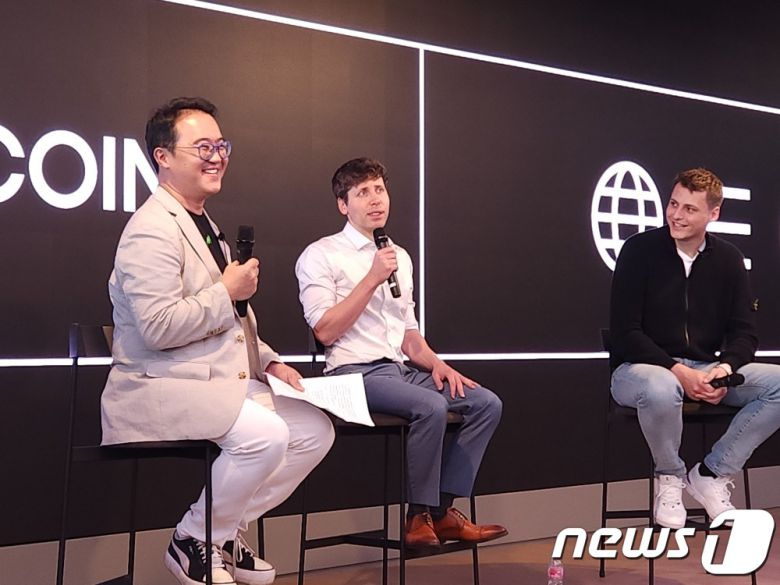 10일 서울 강남구 해시드 오피스에서 진행된 '월드코인 밋업'에서 (왼쪽부터) 손재권 더밀크 대표, 샘 올트먼 오픈AI 대표, 알렉스 블라니아(Alex Blania) 월드코인 창립자가 대담을 나누는 모습.