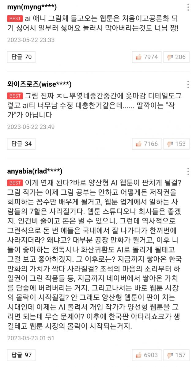 제작사는 후보정 과정에서만 AI 기술을 썼다고 해명했지만 이날 오후 1시 기준 1화의 현재 별점은 2.34점(10점 만점)이다. 이는 네이버웹툰에서 현재 연재 중인 요일웹툰 600여편 가운데 최하위다. 제작사는 반발 여론이 높아지자 1∼6화를 다시 업로드하고 향후에도 AI 보정 없이 연재를 진행하겠다고 밝혔다. 도전만화에 올라온 '팝콘예술고등학교'도 인물들의 상반신만 그려지는 등 생성형 AI를 쓴 듯한 어색한 그림에 비난이 쏟아졌다.