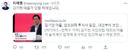 [이데일리 윤정훈 기자] 이재명 더불어민주당 대표는 10일 김기현 국민의힘 대표의 아들이 가상자산 업계에서 근무하고 있다는 보도를 두고 “김기현 대표가 답할 차례”라고 트위터에 글을 남겼다.