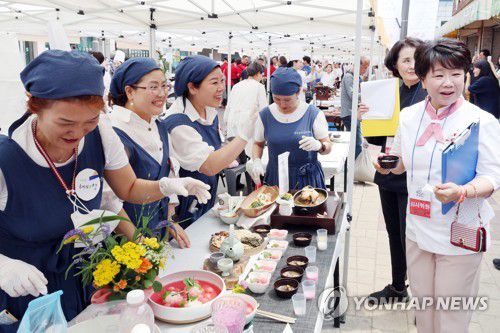 (서울=연합뉴스) 김주성 기자 = 10일 오후 서울 동대문구 서울약령시 한방거리에서 열린 '2023 세계한방요리 페스타'에서 경연대회 참가자들이 심사위원들에게 한방 약재를 넣어 조리한 음식을 선보이고 있다. 2023.6.10