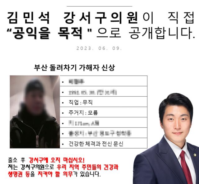 9일 김민석 서울 강서구의회 의원은 자신의 사회관계망서비스(SNS)에 “부산 돌려차기 가해자가 혹시나 출소 후 강서구에 올까 봐 강서구민을 위해 강서구 의원인 제가 ‘공익 목적’으로 가해자 일부 신상을 공개한다”고 밝혔다. 김 의원은 이를 통해 가해자의 얼굴 사진, 이름, 나이, 체격 등을 공개했다.