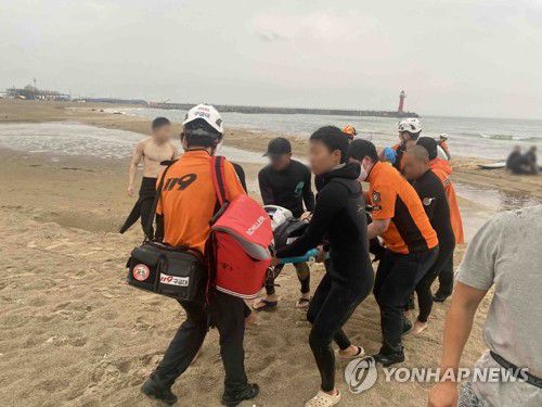 양양 설악해변서 낙뢰 추정 사고(양양=연합뉴스) 이재현 기자 = 10일 오후 7시 33분께 강원 양양군 강현면 전진리 설악해변에서 낙뢰 추정 사고로 6명이 쓰러졌다. 2023.6.10 [강원도 소방본부 제공.재판매 및 DB 금지] photo@yna.co.kr